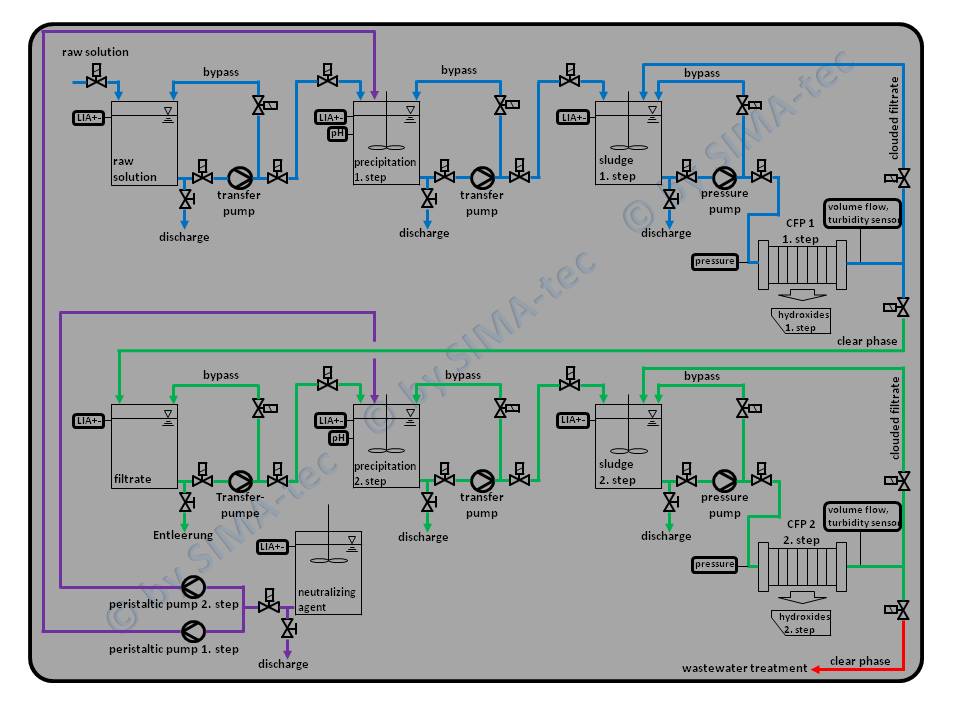 The pilot plant for heavy metal precipitation is a two-step combination unit, which consists of several storage, precipitation and sludge tanks, two chamber filter presses and one neutralizing agent dosing station. It was developed as part of a research project to selectively precipitate heavy metals from various aqueous solutions. The unit is designed, that about 100-150 l/h of raw solution can be subjected to e selective precipitation.