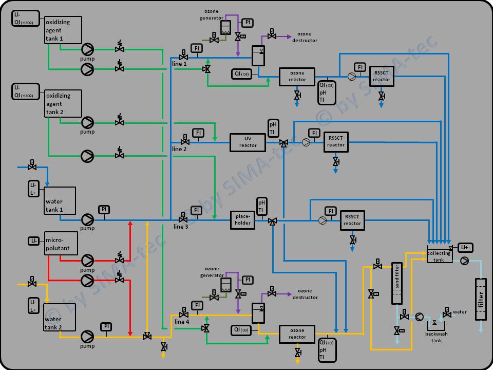 Line 1 and 4 have a H2O2 and ozone dosage, line 2 has a H2O2 dosage and a UV reactor, line 3 has a H2O2 dosage. The effect of the oxidizing agent can be investigated in line 1 and 4 in a tube reactor with a dwell time of about 5-20 minutes. As post treatment, the lines 1 to 3 have a RSSCT-adsorption column (Rapid Small Scale Column Test) and line 4 has a sand filter. The accumulation waste water from the four lines are then collected in a collection tank and discharged from there via an activated carbon filter into the sewer. Numerous sampling valves in the piping, reactors and RSSCT-columns enable a complete sampling of all volume flows. The complex PLC programming with numerous safety devices (e.g. ozone ambient air monitoring) and the data logging via Service Lab enable an independent and safe continuous operation of the pilot plant.
