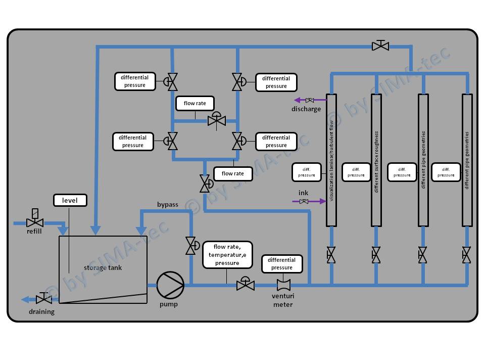 The test bench fluid dynamics was designed and built for student training. The unit can be used for practical courses and training to investigate flow measurement technology, pipe networks, pipe flows and the visualisation of laminar and turbulent flow.